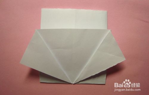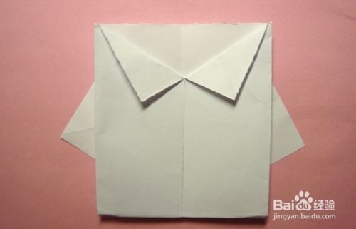 然后,把折纸上边左边纸边向左折成斜三角形,右边纸边向右折成斜三角形,压平整。这是折出衬衣的衣领部分,如下图所示。