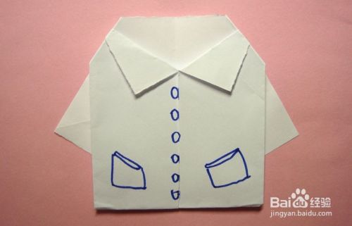 最后在折好的衬衣折纸上画出衣服的扣子和口袋,这样一个衬衣折纸就完成了,如下图所示。用裁出的多余的纸边,用彩色笔画出一个大衣架,把小衬衣折纸放在上面,组成了衣架上的衬衣的场景折纸了。