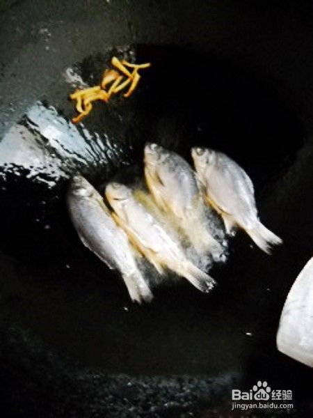 锅中油热,下姜丝爆香,拨一边;下鱼,逐条煎至两面微黄。