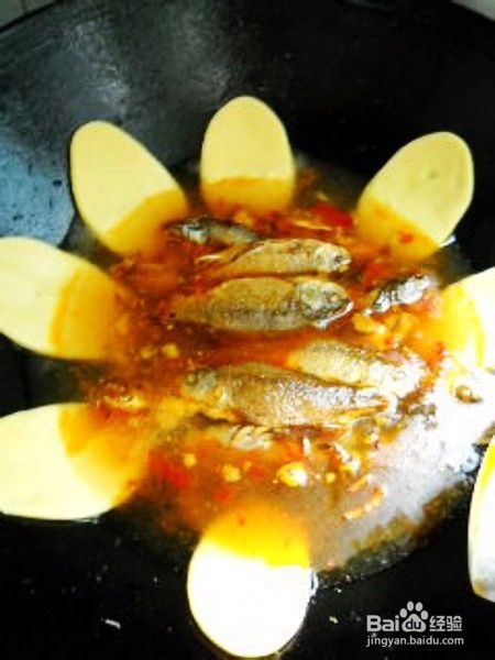将玉米饼沿着锅边缘贴好。加入水,将鱼淹没,玉米饼一半浸在鱼汤里。