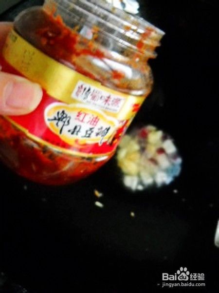 锅中余油,爆蒜瓣,加入郫县豆瓣。