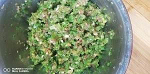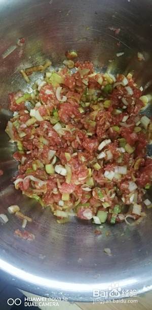 攥干的青椒放到肉馅上,把油倒在青椒上,再跟肉馅拌匀,这样拌馅不出水