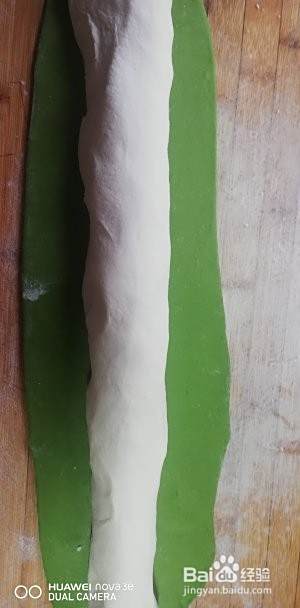 绿色面团擀成长方形面片,包住搓成长条的白色面团,收口捏紧,揪面剂