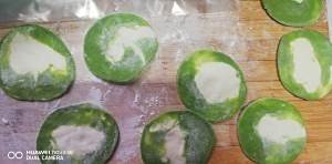 忘记拍照了,菠菜洗净,放榨汁机里,加少许水,榨成汁过滤,加入面,和成绿色面团,再和一块白色面团,醒面