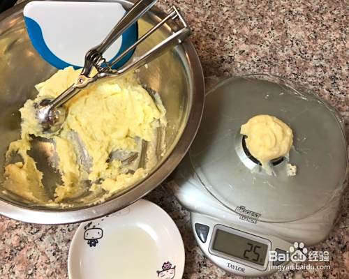面团分成24个小球,每个约22克。你也可以拿勺子吗?涂油后,直接挖一勺面团,轻轻搓揉。我不喜欢戴手套,所以我在旁边准备了一点植物油。每擦两三个球,我就感觉手上粘满了油,然后才继续动手术。