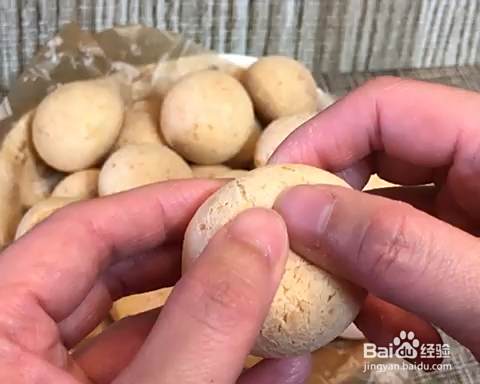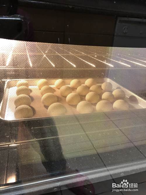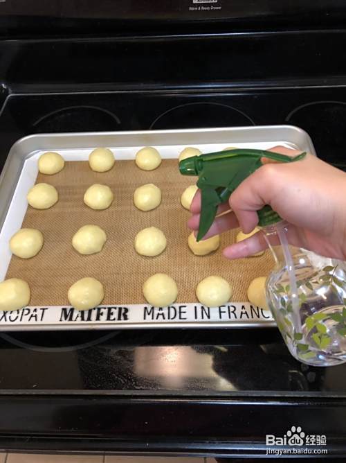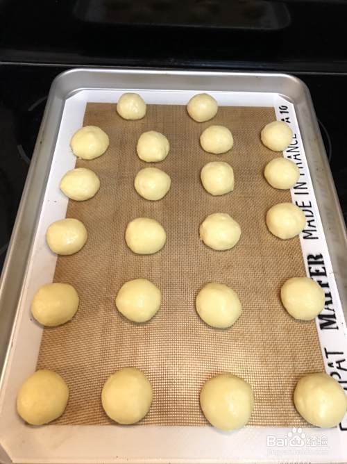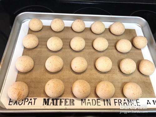 每隔一段时间把它们放进烤盘里。最好把硅胶垫放在烤盘里。如果没有,把烤纸放在上面以防粘上。保持两个手指远离每个球,因为它在烘烤时会膨胀。