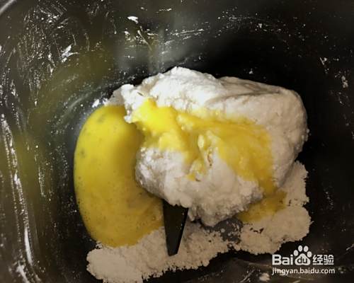 把一半的碎鸡蛋加入一个小组是可以的。继续把它们混合好。附近有没有点干粉没关系。不影响。只有大部分的鸡蛋可以放在一个组里。