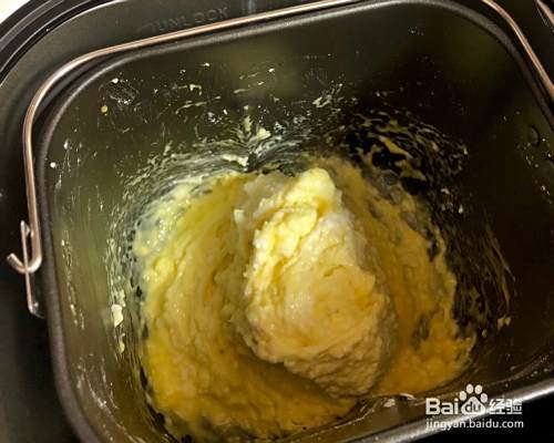 混合的面团有点像汤面包面团,很粘。移到涂油的钢盆上,在刮板上涂油。面团会有点粘。最好戴手套操作,或双手涂油。