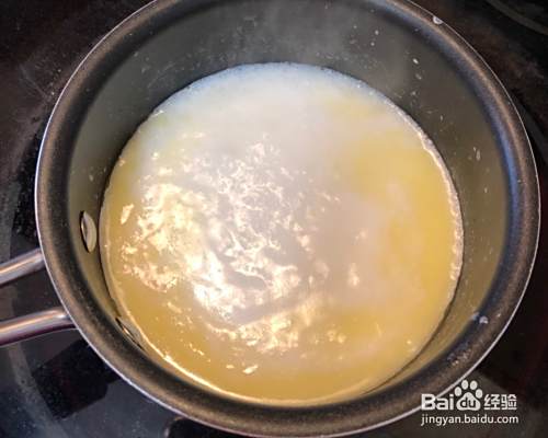 牛奶、水、黄油、糖和盐放在一个小牛奶罐里。用中火和小火加热,搅拌直到黄油完全融化。将液体用中、低热煮沸一分钟,然后关火,迅速倒入木薯粉中。
