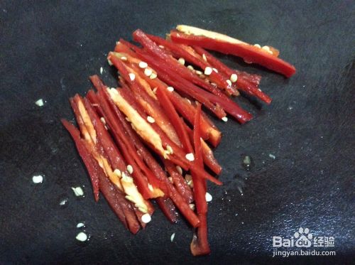 红椒洗净,去蒂,切成丝。