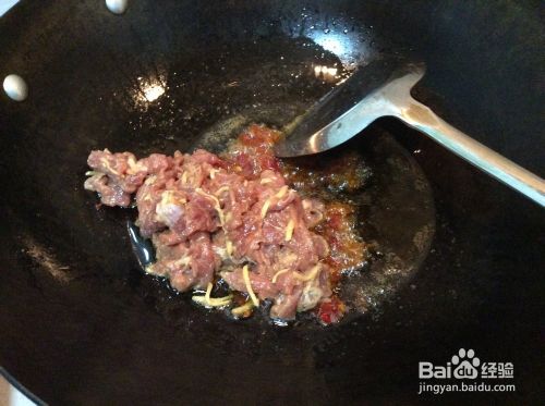 锅中加入食用油,油热后加入豆瓣酱炒香,倒入肉片快速划散,翻炒。炒至肉片变色。