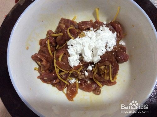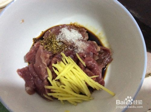 瘦肉切成大小厚薄均匀的薄片。放人姜丝、酱油、花椒面、白糖,拌匀入味,再加入淀粉抓匀,抓匀时手稍带点力,时间不低于1分钟。放置半小时。
