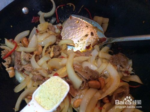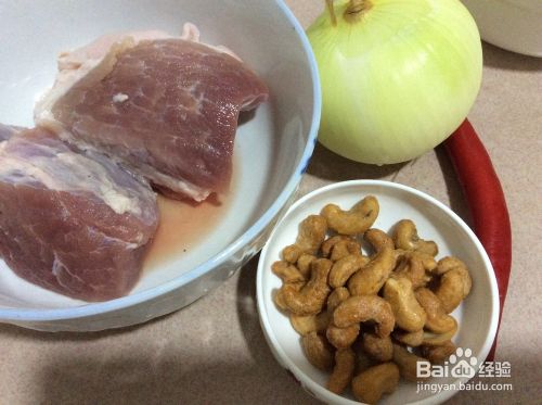 准备食材:洋葱、腰果、猪瘦肉、红椒;佐料:豆瓣酱、酱油、姜、花椒面、白糖、盐、鸡精、淀粉。