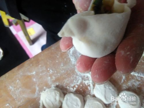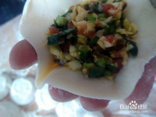 再将饺子馅放入面皮里。再包上,好了!一个饺子,就包好了!等将所有饺子,都包好了!