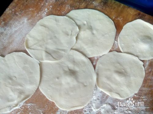 这时,面也醒好了!揪出一块面,和成一个长条。再用刀,切成小几子。再撒上白面,按成小饼。再用杆面杖擀成面皮。