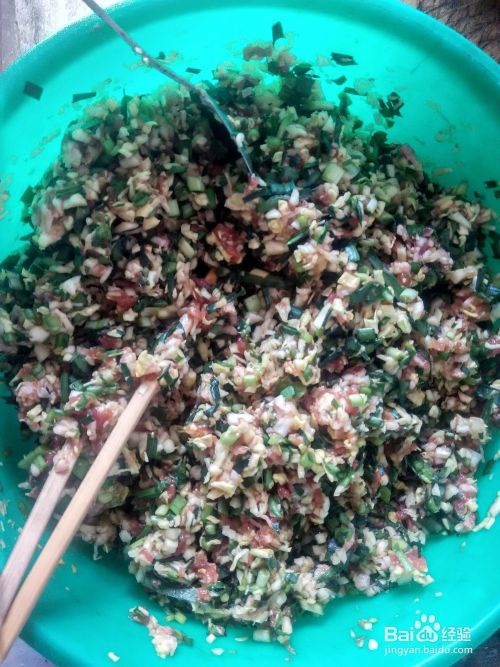 将猪肉馅放入盆里,再放入盐,酱油,十三香和蚝油。顺一个方向搅匀!再放入大头菜沫和韭菜沫,再顺一个方向搅匀。好了!饺子馅和好了!