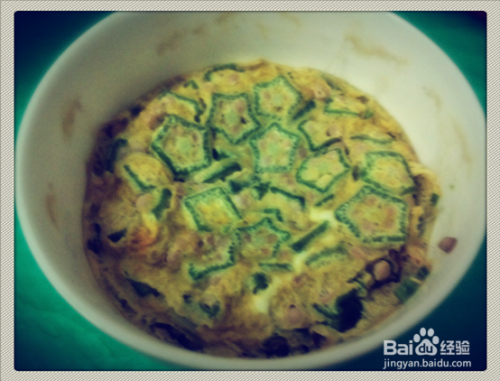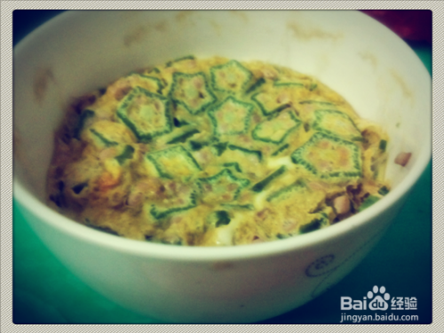 随后把秋葵放入碗内,敲入2个鸡蛋( 秋葵别太多了,2) 3艮就行