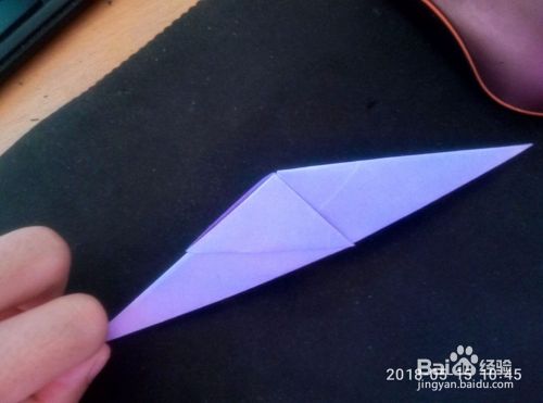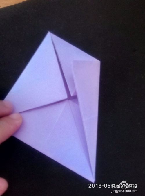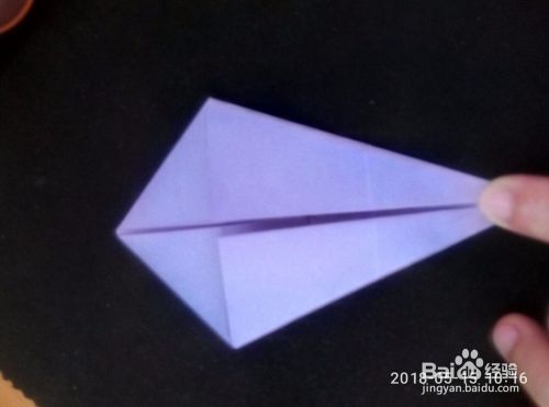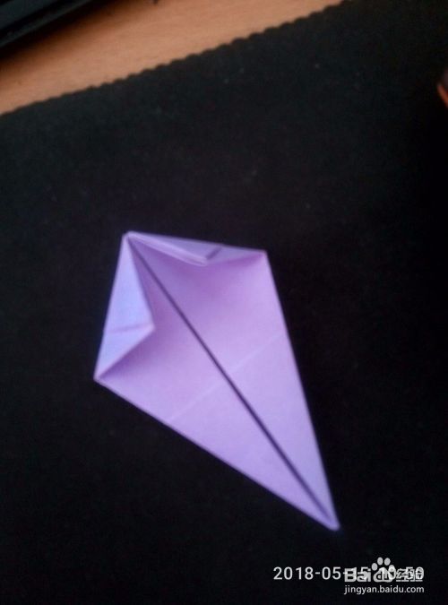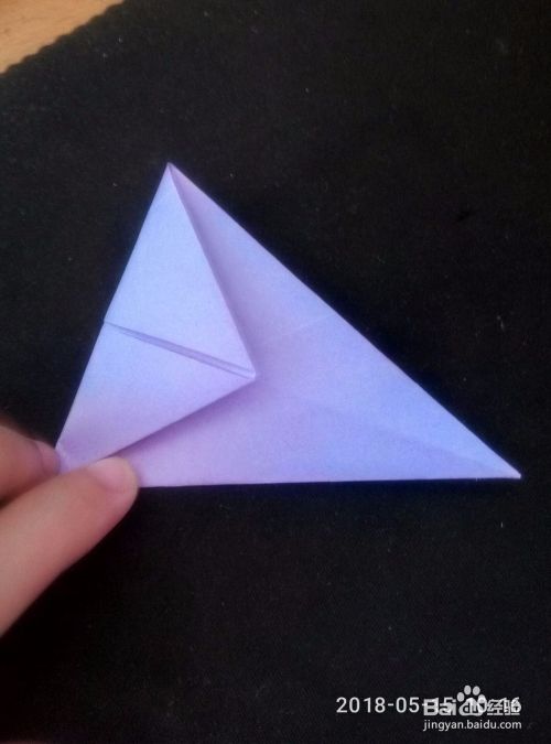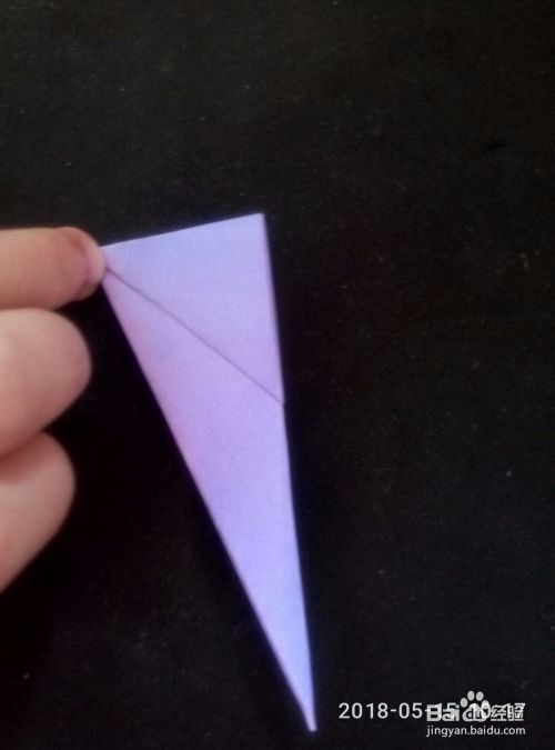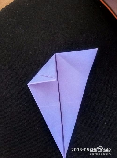 第5步完成后就可以看到一个长长尖尖的三角形内中间还有一个正的三角形,然后在把这个长长尖尖的三角边对边对折,得出一个小的三角形