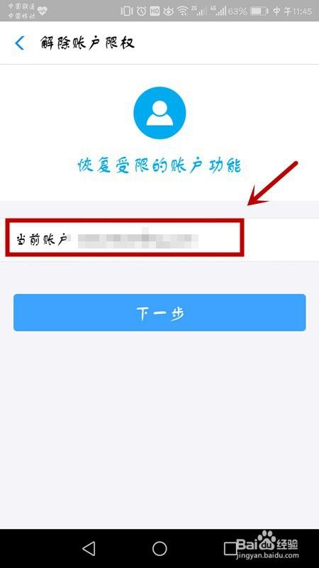 紧接着在恢复受限的账户功能下方输入账户,点击下一步。