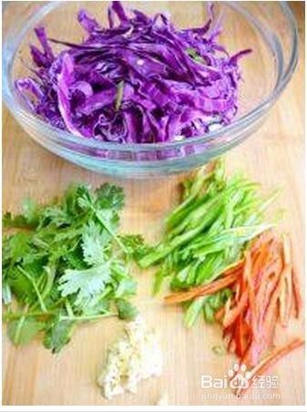 将紫甘蓝切成细丝放于盆中;红绿尖椒切丝、香菜切寸段;大蒜拍碎,一起放于盆中。
