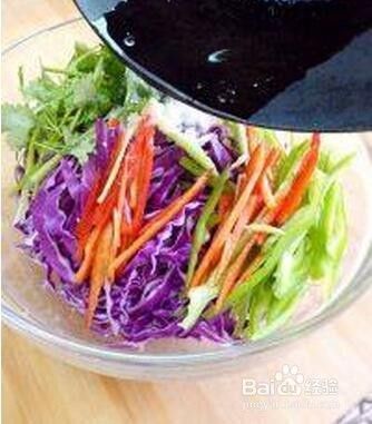 将适量醋、盐、味精、少许糖(橄榄油或香油适量)加入到装有菜丝的盆中,浇上炸好的花椒油