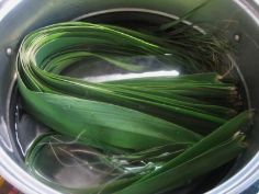 然后架锅添水,往里加入少许的食盐,接着把粽叶浸入,大火煮至沸腾后隔2分钟再关火,继续让粽叶在水里浸泡10分钟,时间一到,取出粽叶,将其冲洗干净便可开始包粽子了。