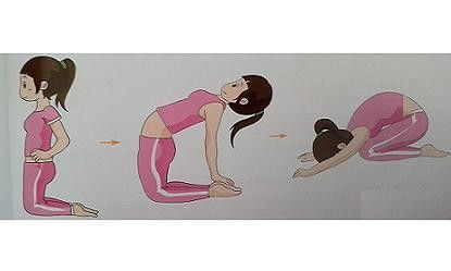 猫式:身体保持跪姿,双臂向前伸展,双手撑地,慢慢吐气并拱背,腹部向内缩起,下巴尽量向内贴近前胸,将“意识”放在自己背部容易酸痛的部位,屏住呼吸10~15秒,然后仰头呼吸,再屏住呼吸10~15秒,将这一动作反复进行2~3次即可。
