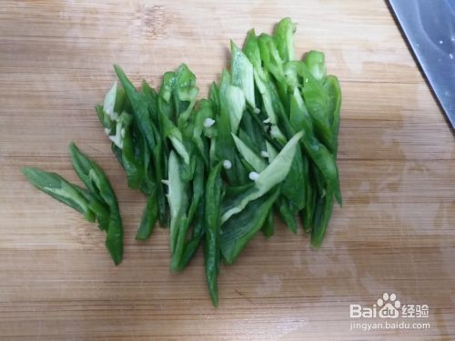取青椒2个,洗净后去蒂去籽切成丝