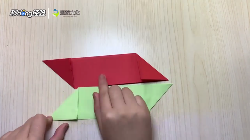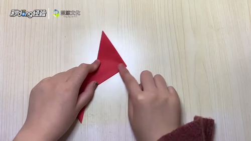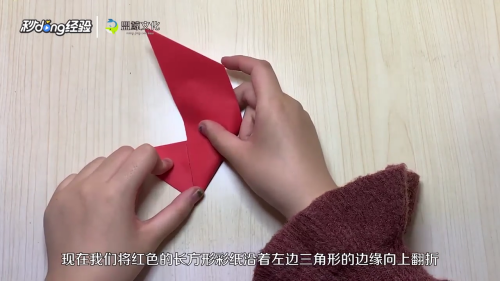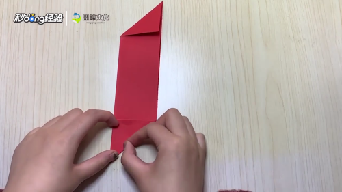 4将红色的长方形彩纸沿着左边三角形的边缘向上翻折。