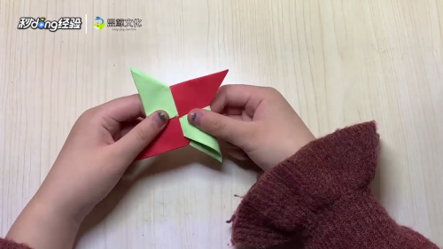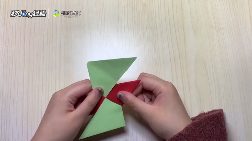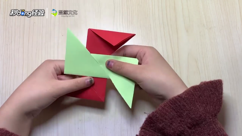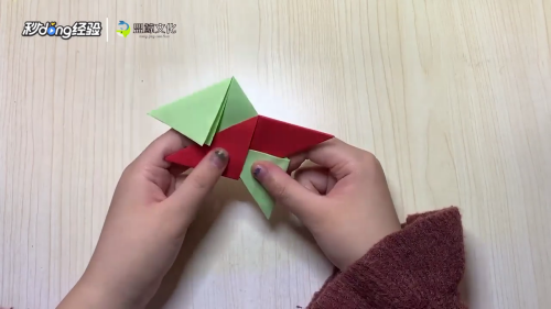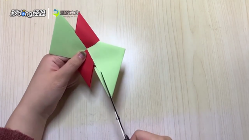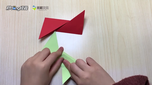11将绿色的三角形折叠好,并将多余的部分用剪刀剪下。