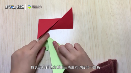 6拿出绿色的长方形彩纸,将长方形彩纸左侧的三角形的边缘向下翻折。