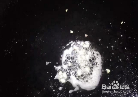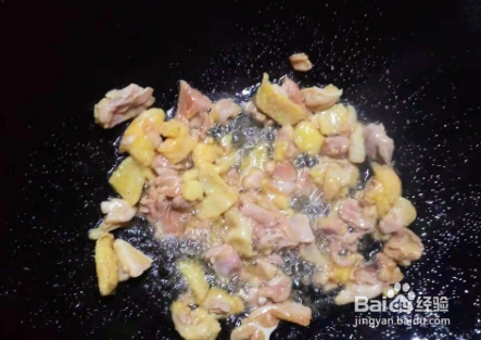 首先预热锅底,倒入2大匙的花生油,放入大蒜爆香后倒入鸡肉翻炒均匀。
