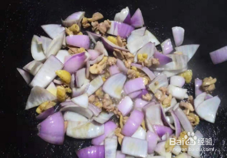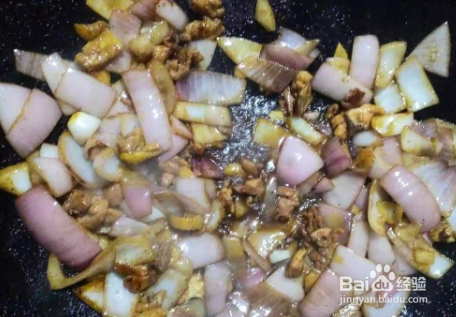 将鸡肉炒到变色后,倒入洋葱,大火翻炒。