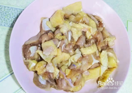 首先我们把鸡肉洗干净,切成小块,加入1大匙料酒、胡椒粉2g和一点花生油,搅拌均匀后腌制10分钟。