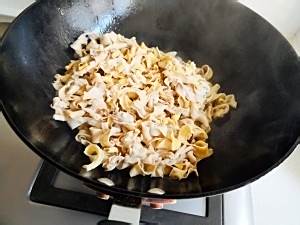 锅中放油,七成热时放入葱姜蒜煸炒。倒入鸭肠,翻炒。