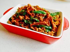 尝一根,差不多到火候了,此时锅里还有一点点汤汁。放入青椒丝。