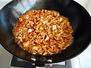 加入所有调料,翻炒2分钟。放入开水,约与鸭肠齐平。鸭肠比较难烧,要焖煮15分钟左右至入味且比较好嚼。