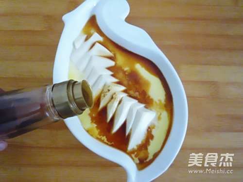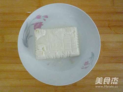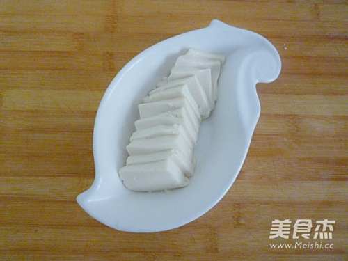 4扣出的嫩豆腐划成小块,放入深一些的容器中