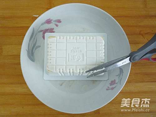 2豆腐撕去塑料封盖,倒扣在盘中,用剪刀在盒子的四角剪个小孔。