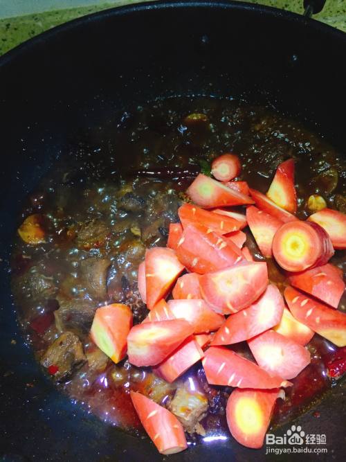 牛肉煮20min后,加入红萝卜块,焖煮5分钟