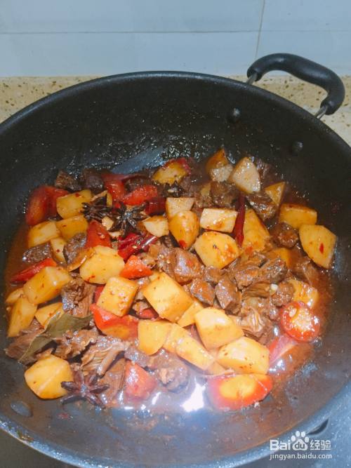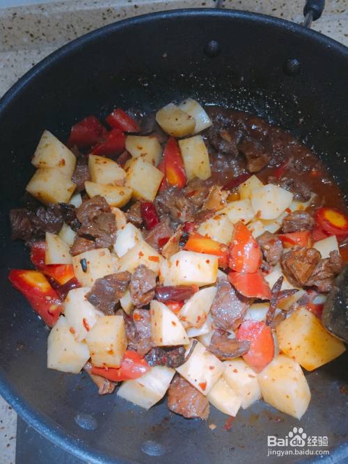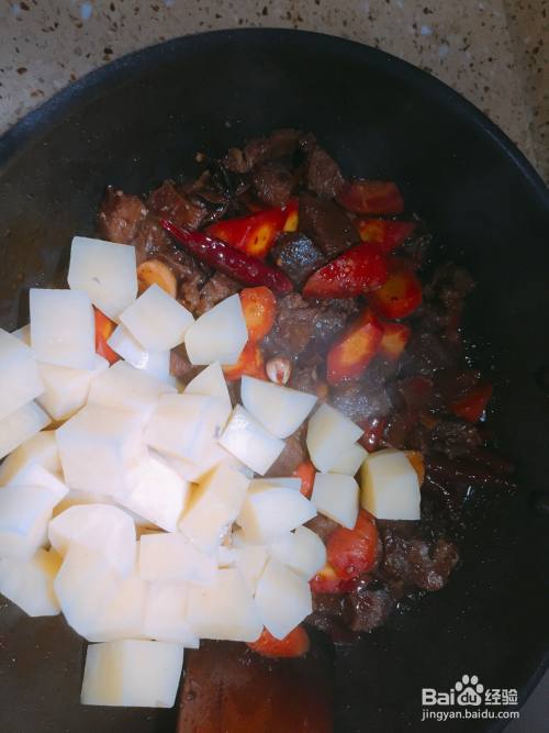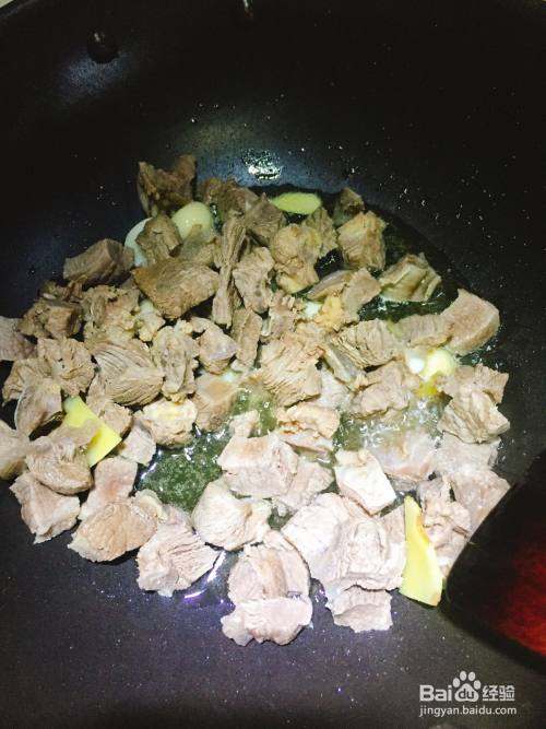 倒入牛肉,翻炒,加入一小勺老抽,2勺生抽。炒制5min,加入刚才煮牛肉的汤,没过牛肉后多出2厘米左右。盖锅盖煮20min。.(注意,煮的过程中,要防止糊锅,汤少了,再加点)