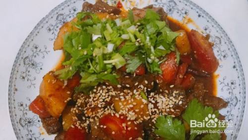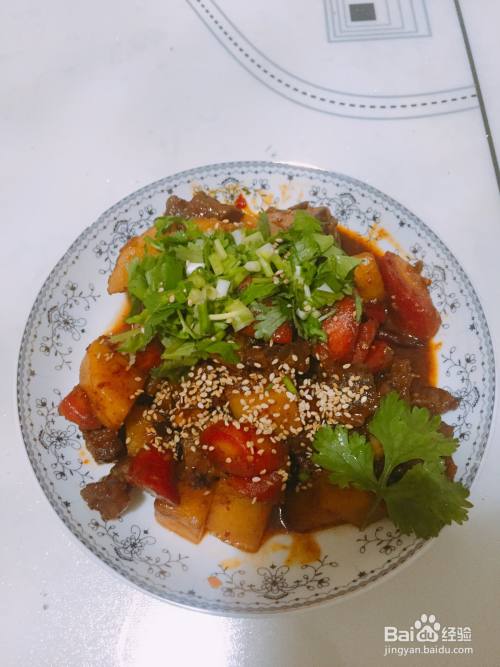 起锅装盘,表面撒少量香菜,葱花,放了一点熟芝麻!好好吃,下饭必备哦!