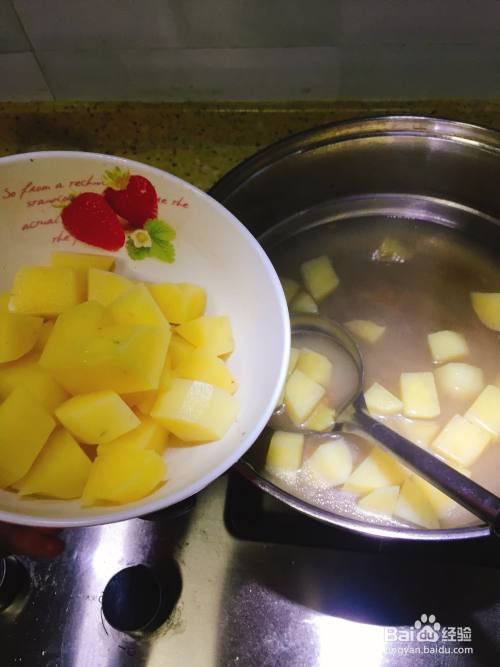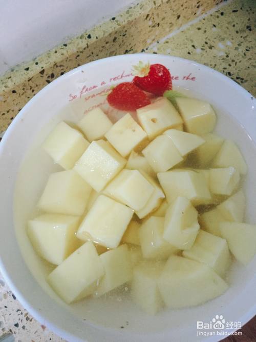 煮牛肉的同时,就可以切配菜了,土豆切好,就放进清水中,以防氧化哦!