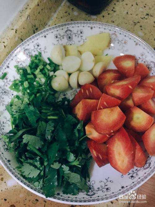 其他配菜如图切好。红萝卜切滚刀,香菜和小葱都切小段,生姜切片,我用的独蒜直接切2半