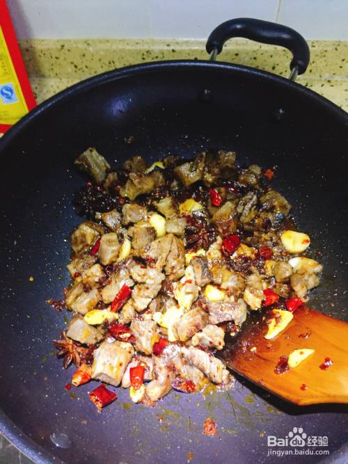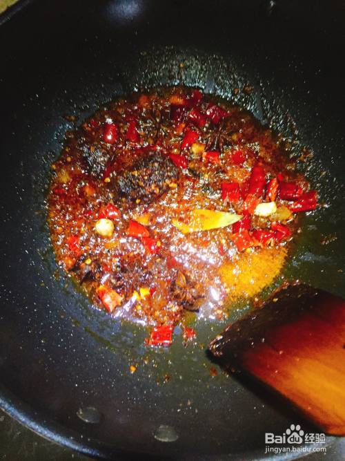 趁热油加入2勺豆瓣酱。1小块火锅底料,辣椒段,花椒10多颗,八角,桂皮,冰糖4颗,超出香味