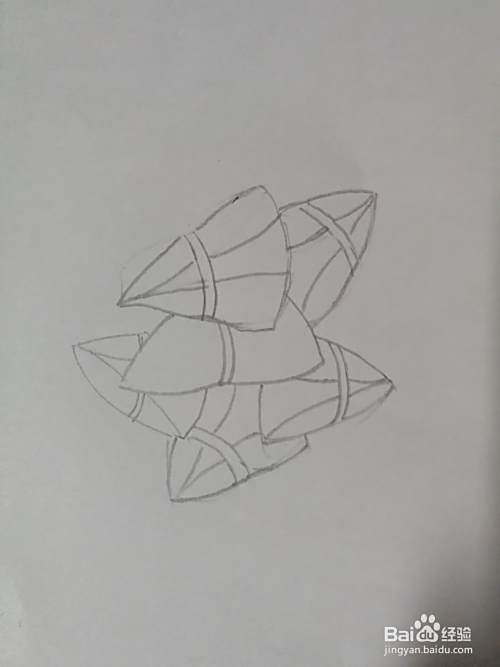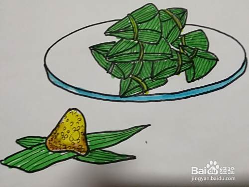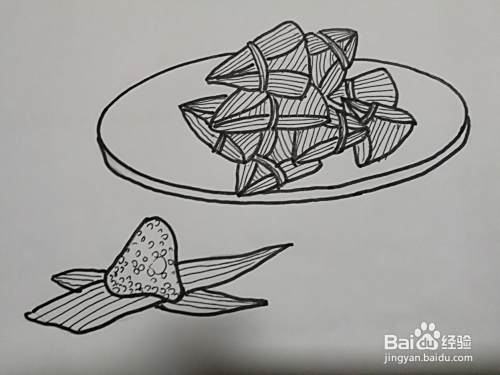 在其它摆位也相继画多粒鲜粽,让其有叠放感,下端的比较浑圆,把粽叶的撕线都渐而勾上,这样多颗绘成。