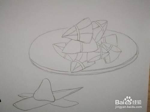在盘外再画一个剥开的棕形吧,撕叶外叉这般延伸的来画,中间的粽果翘起,犹如刚刚撕开。