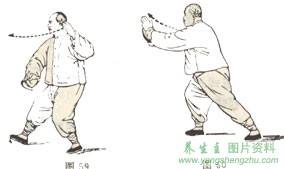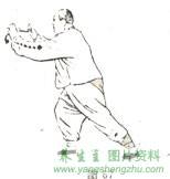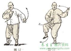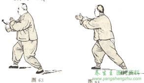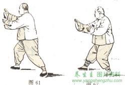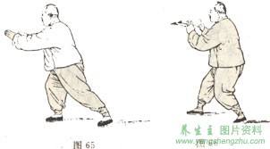 动作二:与前第三式“揽雀尾”(二)掘式动作二相同,惟方向不同,前揽雀尾的弓步、虚步是朝着正西方,此动作以及后面挤、按各动作是朝西北斜方进行的。(图62)