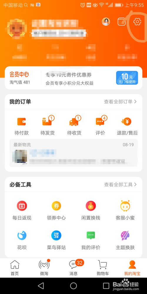 其次是在打开的页面里找到“我的淘宝”点击打开,再打开的页面里的右上角找到“设置”点击打开。