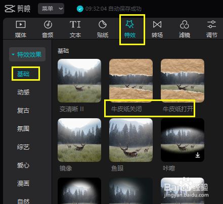 切换到特效面板中,在基础特效效果中可以看到“牛皮纸打开”和“牛皮纸关闭”两个特效,如图所示。